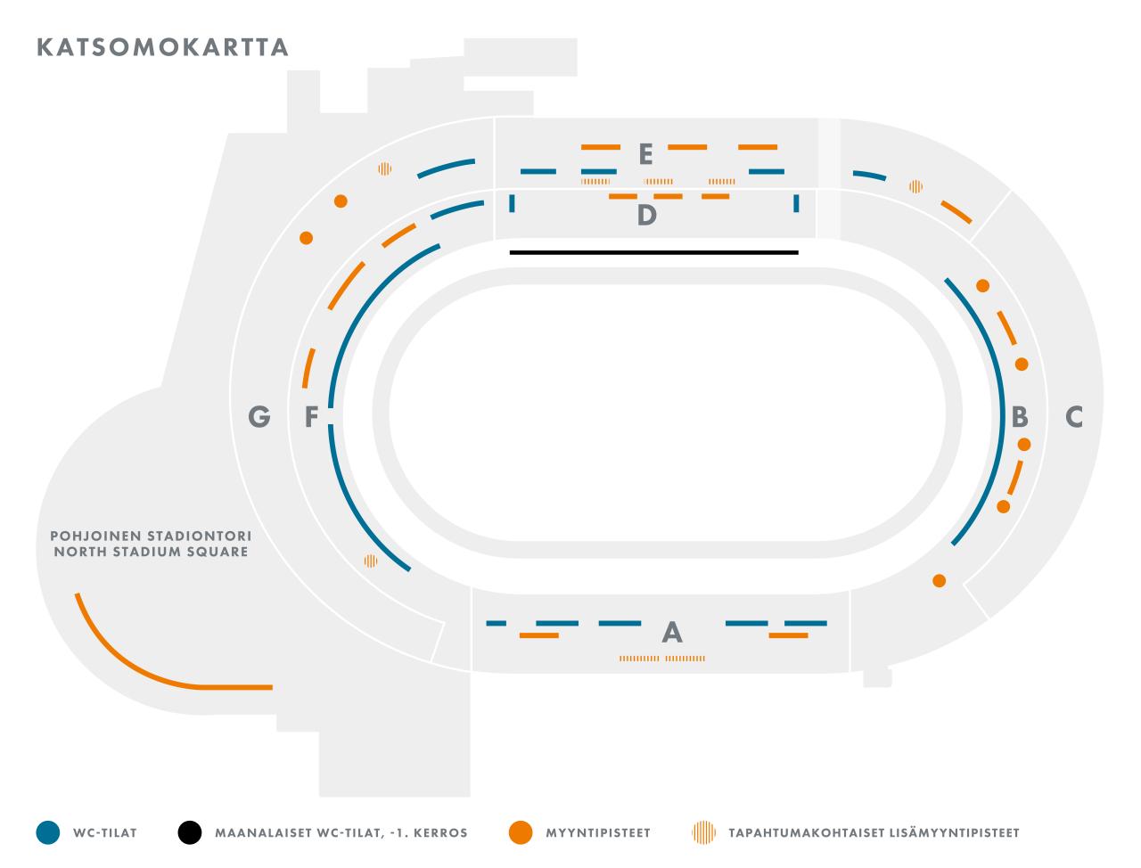 Jokaisen Olympiastadionin suurtapahtuman aluekartan, myyntipisteiden sijainnin tuotevalikoimineen, wc-tilat ja muut palvelut löydät aina tapahtumakohtaisesta interaktiivisesta palvelukartasta. Linkki palvelukarttaan löytyy aina tapahtumakohtaisesta yleisöinfosta www.stadion.fi sivustolla.
